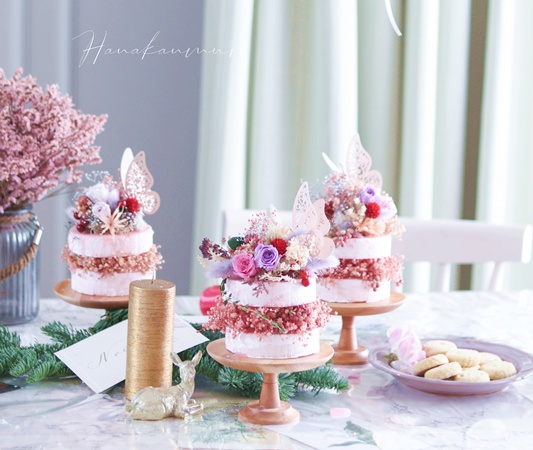 クラフトの要素が入った、食べられないスイーツとお花が融合したわくわく楽しいレッスン。長く飾ってお楽しみいただけます。ご結婚やお祝いのギフトにもっぴたりです。